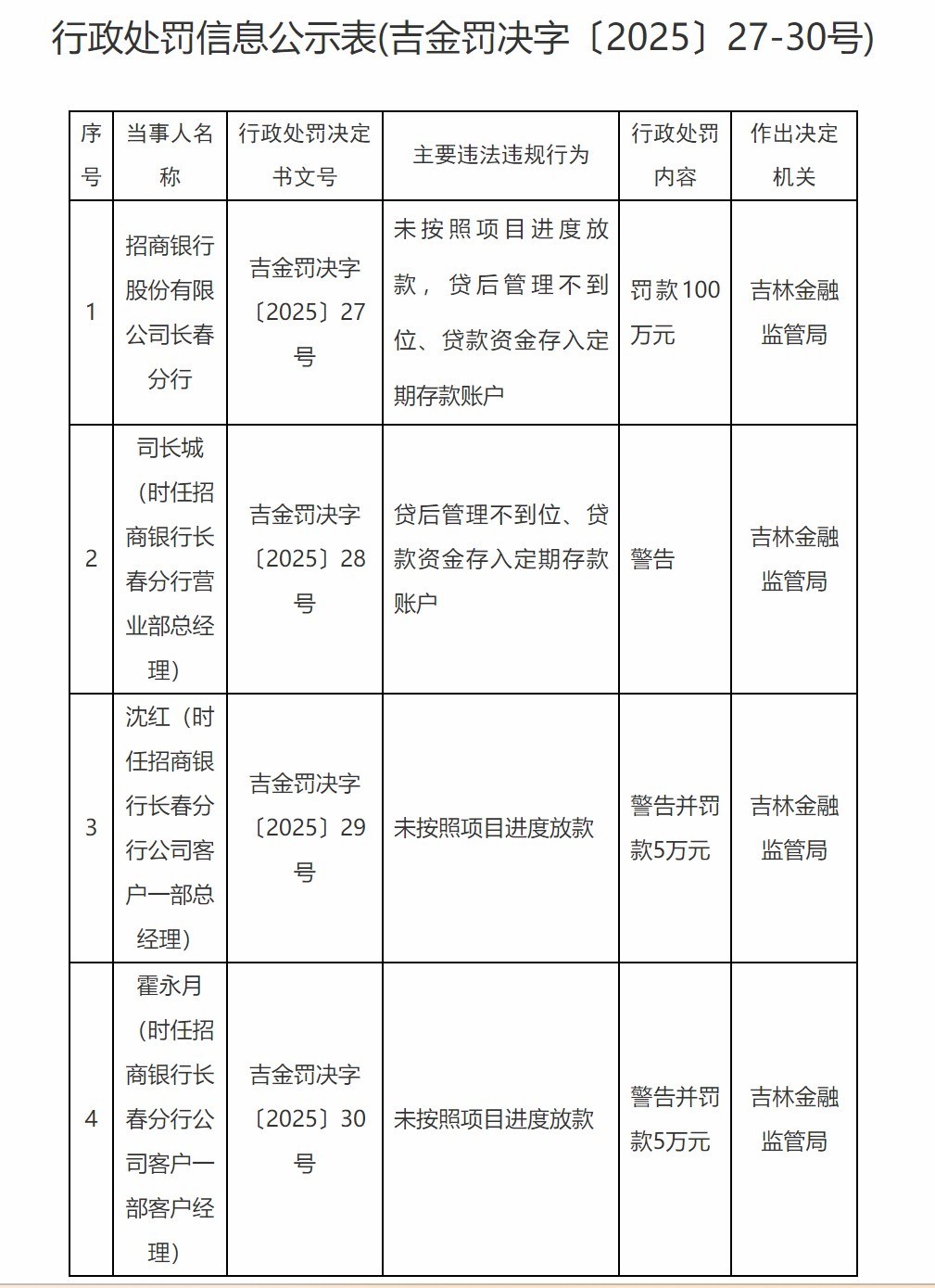 国家金融监督管理总局吉林监管局于2025年2月28日公布的行政处罚信息显示,招商银行股份有限公司长春分行因“未按照项目进度放款”“贷后管理不到位”“贷款资金存入定期存款账户”三项违规行为被处以100万元罚款。与此同时,三名时任分行高管及业务人员分别被给予警告及罚款。